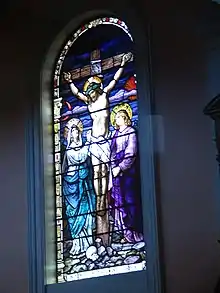 The interior features a large arcaded nave forming a clerestory with two side aisles and a large arch forming the entrance to the sanctuary. Walls are built in a succession of arches surmounted by a cornice of stone which forms part of the roofs of the aisles. Series of stone pilasters are ranged against the walls and on the sides of piers. The style of the capitals of the pilasters is Corinthian. The Basilica has retained its high altar (behind a modern one installed for the post-Vatican II liturgy) and features many fine statues. The 14 great stained glass windows (made by F X Zettler in Munich and purchased through H Credington & Co, Melbourne) represent the mysteries of the Rosary with one (the third sorrowful mystery, "The Crowning with Thorns") omitted.[2] The Sanctuary is dominated by a large oil painting by Giuseppi Brazi[3] of St Patrick and St Brigid interceding with Our Blessed Lady and her Divine Son.[2] The Stations of the Cross, which are of terracotta and framed in oak, were made in Paris in 1901.[3] Thomas Heffernan and his wife Margaret were significant funders of the church and they are notably memorialised in one of the windows.[4]