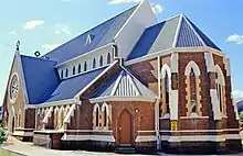 St Paul's Church is a large nineteenth-century Gothic revival building constructed of face brick with polychrome brick and stuccoed detailing. The building has a traditional cruciform plan, with nave flanked by aisles running parallel to Ellena Street, shallow transepts bisecting the nave and an apsidal chancel at the south eastern end. The modern Zincalume-like clad roof is steeply pitched over the nave, with gabled projections over the transepts and hipped over the chancels. The side aisles of the church are skillion roofed and abut the nave below the trefoiled clerestory window openings.[1]