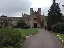 The mansion stands in very close proximity to the church of St Peter.[8] Built of sandstone rubble with Bath Stone dressings, most of the building dates from the mid 19th century or later.[3] The architectural historian John Newman describes the gatehouse as "the most impressive feature" of the mansion[8] and it, and the attached range, are almost the only remaining medieval work. The gatehouse is of three storeys, is constructed of local limestone and has "handsomely battlemented turrets".[8] The upper storeys of the attached range were reconstructed in the 19th century.[8] Newman notes that the house has undergone such significant alteration through its conversion to a hotel that "its historic character has been almost overwhelmed".[8] The gatehouse and range are listed Grade II*.[9]