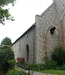 St Symphorian's Church is a flint structure with stone dressings, built in the Early English style.[11][23] The roof is laid with tiles.[10] The building has a wide nave leading into a taller chancel, a Lady chapel and a vestry. An entrance porch stands on the southwest side.[10] The remaining 13th-century structural elements are in the north wall (visible on the inside around one of the windows) and its foundations, and in the south and west walls.[10][21] A Saxon-era fragment from the original (pre-Domesday) chapel has also been identified in the north wall. Also, a piscina of medieval origin was rescued from the ruined chapel and placed on the east wall of the new church.[10]