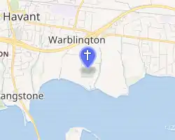 Present-day Warblington is a suburban area in the town of Havant, 1 mile (1.6 km) from the town centre.[3] The original centre of population was a small cluster of houses further south, surrounded by fields and next to a creek between Chichester and Langstone Harbours. They were close to a large farm (still extant), the manor house—now ruined, and known as Warblington Castle—and the original church.[3][4] The population shift, where the core of the village moved north towards the present-day A27 trunk road, has been attributed to the growth of nearby Emsworth, which was always larger; the Black Death; and Richard Neville, 16th Earl of Warwick's creation of a deer park around the manor house during the time he was Lord of the manor.[4]