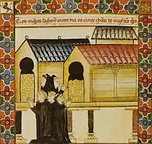 The oldest document containing an image of an hórreo is the Cantigas de Santa Maria by Alfonso X "El Sabio" (song CLXXXVII) from the 13th century. In this depiction, three rectangular hórreos of gothic style are illustrated.[2]