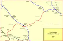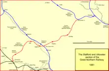 The Stafford and Uttoxeter Railway was authorised by Act of Parliament on 29 July 1862,[1] to build a line between the towns in its title, in Staffordshire, England. It opened for traffic in 1867. It was nicknamed the Clog and Knocker. It opened on 23 December 1867. Construction cost had much exceeded estimates, and income was poor, so that the Company was always in financial difficulty. It was placed in receivership in 1875. The Great Northern Railway (GNR) had running powers to Uttoxeter and was persuaded to acquire the Company, which it did in 1881. The GNR spent a considerable sum on improving the line, but it never made money and it was closed to passengers on 4 December 1939. Goods traffic ceased in 1951, except for a short stub to RAF Stafford; this too closed in 1975.