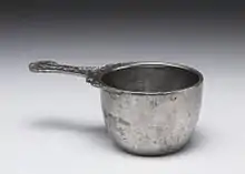 The Staffordshire Moorlands Pan, although lacking its handle and base, is an extremely well preserved enamelled and inscribed bronze (strictly speaking, "copper alloy") vessel for cooking and serving food, decorated in a Celtic style. (The Celtic peoples of the Roman period made more use of enamel on metal than other parts of the Empire.) It weighs 132.5 g, and is 47 mm high with a maximum diameter of 94 mm, and is 54 mm around the outside of the base.[2]