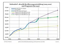 Recent Population Development and Projections (Population Development before Census 2011 (blue line); Recent Population Development according to the Census in Germany in 2011 (blue bordered line); Official projections for 2005-2030 (yellow line); for 2017-2030 (scarlet line); for 2020-2030 (green line)