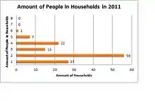 These two graphs show the number of people who live in each household in Stainton and also the type of households that dominate the parish of Stainton. The graph on the left concentrates on the number of people who occupy households in the parish. As the data shows two person households dominate the parish with 46.75% (56) houses.[1] Owing to this dataset it could potentially mean that the houses are occupied by married couples without dependent children or even retired couples who have chosen to live in the parish. The graph also shows that there are not many houses occupied by larger families as only eight houses have five people or more in them. These few houses could be families who have dependent children, although it does not seem that there are many households of this composition so it may not entice families looking to move to live in the Stainton. The pie chart on the right shows the type of households which are in the Parish. The majority of the homes are detached or bungalows, followed by semi-detached homes.[1] Due to over half of the homes being detached it shows that it is unlikely that there is a street lined with houses along them. These homes may be occupied my small families, married couples or retired workers.