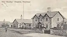 The hospital was financed by a gift from William Owen Stanley of Plas Penrhos who had wanted to establish a facility to provide healthcare to sailors.[1] It was officially opened in 1871.[2] During the First World War it served as a military hospital with Jane Henrietta Adeane, a niece of the founder, as its commandant.[3] When the Elder Dempster liner SS Apapa was torpedoed off Anglesey in November 1917, survivors were taken to the hospital to be treated.[4] The facility then served as a convalescent home for disabled servicemen before joining the National Health Service as a community hospital in 1948.[5] After services transferred to Valley Hospital, Stanley Sailors' Hospital closed in 1987.[1] The buildings were subsequently demolished and the site was redeveloped as a ferry terminal.[1]