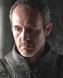 Stannis Baratheon is a fictional character in the A Song of Ice and Fire series of epic fantasy novels by American author George R. R. Martin, and its television adaptation Game of Thrones.[1] He is the second son of Steffon Baratheon and Cassandra Estermont, as well as the brother of Robert – lord of the Seven Kingdoms, and Renly – lord of Storm's End. He is the Lord of Dragonstone, and after his elder brother's death, becomes a claimant to the Iron Throne of Westeros and a key player in the subsequent civil war. Stannis's goals are frequently impeded by his lack of manpower and resources, owing to his unpopularity with other noble houses. He must therefore rely on the counsel of the foreign priestess Melisandre and his right-hand man, lowborn smuggler Davos Seaworth, who he later promotes to Hand of the King. Stannis often struggles to escape the shadow of his two more overtly charismatic brothers, particularly Robert.