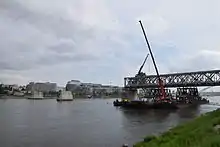 On January 1, 2009 the city of Bratislava closed the bridge to motor vehicles except buses because of problems with statics[2] and on May 15, 2010 also for buses, pedestrians and cyclists.[3] The bridge was reopened to cyclists and pedestrians a few months later after the road for cars was removed and remained open until 8:00 AM on 2 December 2013 when it was closed for all traffic again due to its deconstruction which started in late November 2013. As of December 2015, the bridge was replaced by a new one for pedestrians, cyclists and trams, as part of new tram track to Petržalka.