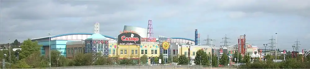 This former derelict industrial land was developed as part of a regeneration scheme for the Heartlands area and to change Birmingham's image for the 21st century. Its centrepiece is the 25-screen (formerly 30-screen) Vue cinema, at the time the largest cinema in Europe and originally opened as Warner Brothers Cinema. The construction was carried out by Wolverhampton based firm Carillion.[2] The complex was formally opened in July 2000 by actors George Clooney and Mark Wahlberg to coincide with the UK premier of The Perfect Storm. With some 392,000 square feet (36,400 m2) of leisure space, it is one of the largest leisure complexes in the United Kingdom.[3]