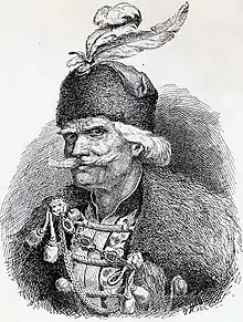 Starina Novak is venerated as a hero in the Serbian epic poetry,[4] as the central figure in poems such as Starina Novak i knez Bogosav, Starina Novak i deli Radivoje, and others. Some poems confuse Starina Novak with an older military commander,[5] Novak Debelić, a nobleman from the 15th century; thus, the character of Starina Novak in epic poetry could be said to include two individuals.[6]
