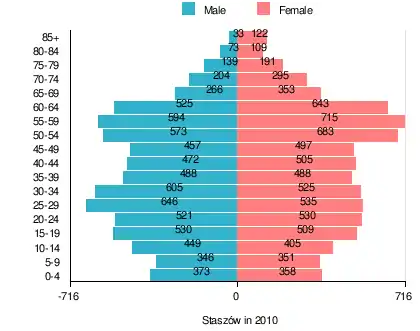 According to the 2011 Poland census, there were 15,108 people residing in Staszów town, of whom 48.3% were male and 51.7% were female. In the town, the population was spread out, with 19% under the age of 18, 38.2% from 18 to 44, 26.8% from 45 to 64, and 16.1% who were 65 years of age or older.[1]