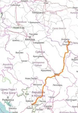 | To | Serbia-Kosovo[lower-alpha 1] border at Merdare, Road M25 Kosovo-Albania border at Vërmica, State Road SH5 | |||