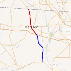 State Road 53 (SR 53) is a 19.170-mile-long (30.851 km) north–south state highway in the panhandle of northern Florida. Its southern terminus is an interchange with Interstate 10 (I-10; which also carries the unsigned designation of SR 8) near Lee and Madison; the northern terminus is at the Georgia state line near Cherry Lake, Florida. Part of SR 53, from Harvey Greene Drive north to SR 14, is also signed SR 14 Truck, a rare special state highway in Florida.