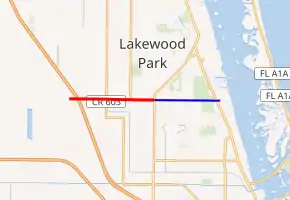 State Road 614 (SR 614), locally known as Indrio Road, is a 3.6-mile-long (5.8 km) east–west street serving a rural section of northern St. Lucie County, Florida, just south of Lakewood Park. The road has a 2.8 miles (4.5 km) eastern extension designated County Road 614 (CR 614).