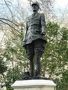 The statue was campaigned for by Mary Soames, the daughter of De Gaulle's contemporary Winston Churchill.[2] It was unveiled by Queen Elizabeth The Queen Mother on 23 June 1993 in the presence of then Mayor of Paris Jacques Chirac and President of the National Assembly Philippe Séguin,[1] as well as De Gaulle's chauffeur-translator Olivia Jordan.[3] The architect was Bernard Wiehahn and the sculptor Angela Conner.[4] De Gaulle is portrayed in the uniform of a brigadier-general.[5] The statue is one of 39 in London that are protected by English Heritage, the majority of which are in Westminster.[6]