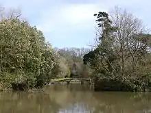 The park contains a lake called Leigh water.[14] Prior to its construction its site was home to a pond a few yards in diameter.[15] Its initial construction of the lake took place between 1828 and 1836.[14] A three arched bridge known as the Chinese bridge was built in 1830[14] and in 1832 two buildings were added; a boathouse apparently built to a Chinese design and a Pergola.[16] In either 1832 or 1834 an ornamental Kiosk was added to the lakeside.[17] It featured an onion dome surrounded by small Minarets. In 1835 a Chinese themed summer house was built by the site of the lake.[17]