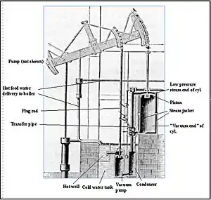 The Cornish engine was developed by Trevithick and others in the 1810s.[30] It was a compound cycle engine that used high-pressure steam expansively, then condensed the low-pressure steam, making it relatively efficient. The Cornish engine had irregular motion and torque though the cycle, limiting it mainly to pumping. Cornish engines were used in mines and for water supply until the late 19th century.[31]