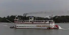 The ninth and current Natchez, the Str. Natchez, is a sternwheel steamboat based in New Orleans, Louisiana. Built in 1975, she is sometimes referred to as the Natchez IX. She is operated by the New Orleans Steamboat Company and docks at the Toulouse Street Wharf. Day trips include harbor and dinner cruises along the Mississippi River; it is modeled not after the original Natchez, but instead on the steamboats Hudson and Virginia. Its steam engines were originally built in 1925 for the steamboat Clairton, from which the steering system and paddlewheel shaft also originated. From the S.S. J.D. Ayres came its copper bell, made of 250 melted silver dollars. On top, the bell has a copper acorn that was once on the Avalon, now known as the Belle of Louisville, and on the Delta Queen. It also features a steam calliope, made by the Frisbee Engine Company, that has 32 notes. The wheel is made of white oak and steel, is 25 feet (7.6 m) by 25 feet (7.6 m), and weighs 26 tons.[2] The whistle comes from a ship that sank in 1908 on the Monagabola River. The Natchez was launched from Braithwaite, Louisiana. It is 265 feet (81 m) long and 46 feet (14 m) wide and has a draft of six feet, weighing 1384 tons. It is mostly made of steel, due to United States Coast Guard rules.[3]