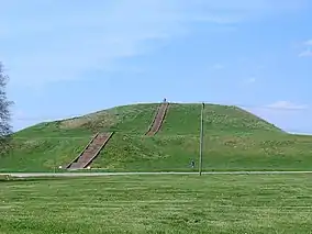 The largest earthen work step pyramid of this type in North America is Monks Mound, located in present-day Cahokia, Illinois. With the base of the structure exceeding 16 acres[11] Monks Mound is also one of the largest pyramids by area in the world (after El Mirador and Great Pyramid of Cholula).