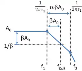 Next, the choice of pole ratio τ1/τ2 is related to the phase margin of the feedback amplifier.[9] The procedure outlined in the Bode plot article is followed. Figure 5 is the Bode gain plot for the two-pole amplifier in the range of frequencies up to the second pole position. The assumption behind Figure 5 is that the frequency f0 dB lies between the lowest pole at f1 = 1/(2πτ1) and the second pole at f2 = 1/(2πτ2). As indicated in Figure 5, this condition is satisfied for values of α ≥ 1.