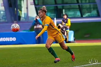 In the summer of 2015 at age 21, Catley competed with the Matildas at the 2015 FIFA Women's World Cup in Canada.[59] During the tournament, Catley played every minute of all five of Australia's matches in the left back position, tallying a total of 450 minutes. She made eight tackles and won them all. Catley also made 12 interceptions and won 13 duels. Her passing accuracy was measured at 72.4%.[3] The Matildas lost 3–1 to the United States during their first group stage match.[60] Catley helped hold Nigeria to a 2–0 shutout in the team's second group stage match[61] and a 1–1 draw against Sweden.[62] Australia finished second in the "Group of Death"[63] and advanced to the Round of 16 where they faced Brazil and won 1–0 as the underdog team.[64] The Matildas faced 2011 champions, Japan in the quarterfinals and narrowly lost 1–0 after Japan scored a last–minute goal in the 87th minute.[65]