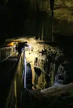 Before Bishop, the farthest anyone had been in the cave was to the feature known as "The Bottomless Pit". Along with a guest named H.C. Stevenson,[11] (who allegedly offered Bishop a "fistful of money" to explore the unknown parts of the Cave)[1] Bishop journeyed to the edge of the Pit. Though later tales said it was a cedar sapling,[12] more reliable sources state it was a tall ladder[1] or series of ladders[11] laid across the mouth of the Pit that enabled Bishop and his guest to venture across to the other side, opening up a whole new part of the cave. Bishop is also said to have discovered eyeless fish, probably specimens of Amblyopsis spelaea or the Northern cavefish.[13]