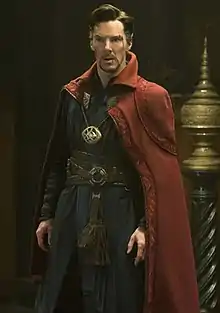 In his first feature-length appearance in the MCU, Dr. Strange is a neurosurgeon who, after a car crash that led to a journey of healing, discovers the hidden world of magic and alternate dimensions. Cumberbatch described Strange as arrogant, with the film "about him going from a place where he thinks he knows it all to realizing he knows nothing."[17] He compared the character to the version of Sherlock Holmes that he portrays in Sherlock, calling both characters "intelligent" and having "smatterings of the same colors".[18] The film's mysticism resonated with Cumberbatch, for whom spirituality has been important since he spent his gap year teaching English at a Tibetan Buddhist monastery in Darjeeling, India.[19][20] Strange's abilities in the film include casting spells with "tongue-twisty fun names", creating mandalas of light for shields and weapons, and creating portals for quick travel around the world. Strange is also aided by a Cloak of Levitation for flight, and the Eye of Agamotto, a relic containing an Infinity Stone that can manipulate time.[21][22] Cumberbatch took great care in defining the physical movements and gestures for the spells, knowing that they would be noted and studied by fans.[23] He described these gestures as "balletic" and "very dynamic",[24] and received help with finger-tutting movements from dancer JayFunk.[25]