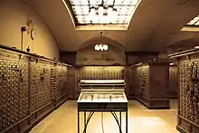 The Rare Book Room, designed after English Jacobean architecture, was built to allow library patrons to browse Yale's collection of rare books and manuscripts.[11] A vaulted, octagonal chapel behind the room was specially constructed to house a copy of the Gutenberg Bible.[5][11] The completion of the Beinecke Library in 1963 provided a more secure, climate-controlled repository for rare books, and the room and chapel now serve as a browsing room for the library's Manuscripts & Archives department.