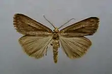 The wingspan is 25–35 mm. There is one generation per year, with adults on wing from September to October.
