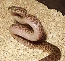 Children's python (Antaresia childreni) is a species of nonvenomous snake in the family Pythonidae. The species is named after John George Children. It is a nocturnal species occurring in the northern half of Australia and generally found on the ground, although it often climbs trees. Usually growing to about 1.0 m (3 ft) in length or more depending on the polymorphic variant, it is typically a reddish-brown colour, darker on the upper surface, and with many darker blotches, especially on younger specimens. The Stimson's python variant has much stronger and more variable colors; often being adorned with reddish-brown to chocolate blotches against lighter tan.[4] It feeds mostly on small mammals and birds, and as with other pythons, it constricts its prey before swallowing it whole. It is a popular pet among reptile enthusiasts.