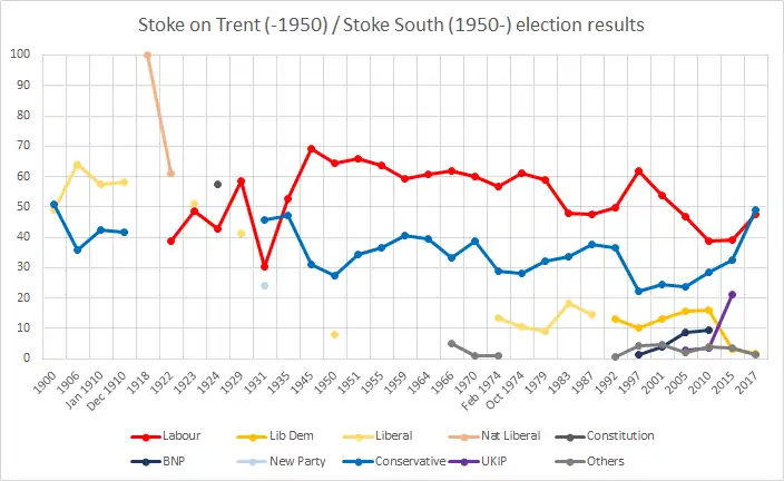 Stoke-on-Trent South is a constituency[n 1] created in 1950, and represented in the House of Commons of the UK Parliament since 2017 by Jack Brereton, a Conservative.[n 2] The local electorate returned a Labour MP in every election until 2017, when Brereton became its first Conservative MP.[2] The seat is non-rural and in the upper valley of the Trent covering half of the main city of the Potteries, a major ceramics centre since the 17th century.