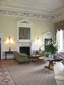 The two-storey house has a symmetrical facade with projecting wings either side of the central doorway with a Tuscan portico.[1] The ashlar is dressed with plaster and stone to highlight architectural features. The rear of the building is plainer than the front and is without the plaster dressing.[17] The interior is decorated with plaster mouldings and engravings on the ceilings and fireplaces.[1] The entrance hall leads via mahogany doors to the 32 feet (9.8 m) by 24 feet (7.3 m) saloon. Further highly decorated rooms include the dining room and library.[17] An octagonal bathroom contains a plunge bath used by Lady Hippisley which is believed to have been designed by Sir John Soane or one of his pupils such as George Allen Underwood.[18]