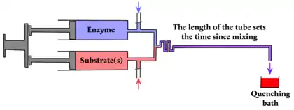 The stopped-flow method depends on the existence of spectroscopic properties that can be used for following the reaction. When that is not the case quenched flow provides an alternative that uses conventional chemical methods for analysis.[8] Instead of a mechanical stopping system the reaction is stopped by quenching, the products being delivered to a recipient that stops the reaction immediately, either by instantaneous freezing or by denaturing the enzyme with a chemical denaturant or exposing the sample to a denaturing light source. As in the continuous-flow method, the time between mixing and quenching can be varied by varying the length of the tube.