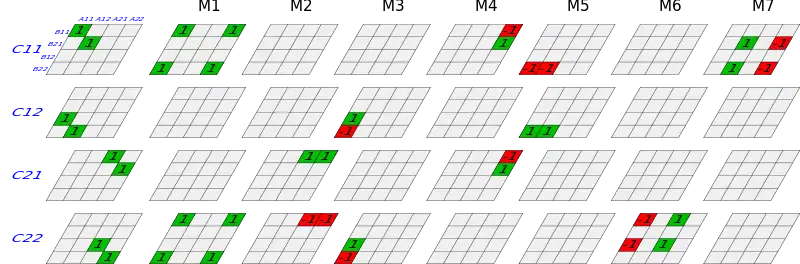 The left column represents 2x2 matrix multiplication. Naïve matrix multiplication requires one multiplication for each "1" of the left column. Each of the other columns represents a single one of the 7 multiplications in the algorithm, and the sum of the columns gives the full matrix multiplication on the left.