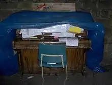 The Public Piano Project in Joshua Tree, California began as a public grand piano Valentine Gift to the community in 1995 as the Self Serve Serenade by artist Piano Bob (aka Bob Fenger). In 2002 Piano Bob began a donated piano consolidation project building a weather proof outdoor piano from the parts of 3 pianos and installed April 2004 in front of Joshua Tree Health Foods. It was enjoyed by thousands of Joshua Tree National Park Visitors and locals for nearly 2 years and was reinstalled 20 April 2012 at the Coyote Corner Gift Shop in Joshua Tree as the first Public Prepared Piano.[17] The piano is reminiscent of a Gamelan Orchestra prepared with everyday items such as coins, screws, paper mutes, wedged into the strings in a typical John Cage manner (inventor of the prepared piano in the 1940s also see Bob Fenger's Acoustisizer at Prepared piano 2.10). The Public Prepared Piano is the third phase of the Public Piano Project dedication to unknown closet pianists, art in public places, and instant drum circle fun around a keyboard. Through regular tuning and maintenance of the public pianos another opportunity presented itself for the public to observe, learn and interact with the total Public Piano Project experience. Questions like:how long does it stay in tune outside? The short answer: the colder the better the more in tune. The fact that Joshua Tree is in the High Desert above Palm Springs with many 100 degree plus days in the summer gave numerous opportunities for tuning, sharing and exchanging ideas. The artist's stated intention:[18] 'The Public Piano Project creates momentary beauty thoughts and ideas that resonate out across fields, parking lots and sidewalks. It invites others to play along and gives way to song and laughter, accidental bonding and new friends; even possibly an ephemeral center of insight and change'. On 21 December 2012 Piano Bob launched his fourth phase of the Public Piano Project with the Prepared and Unprepared dueling pianos for peace at the Joshua Tree Hospice.[19] Public Piano Locations[20] Public Piano Tour Pictures 2007.[21][22][23][24]