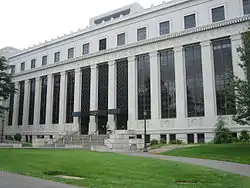 Stripped Classicism (or "Starved Classicism" or "Grecian Moderne")[1] is primarily a 20th-century classicist architectural style stripped of most or all ornamentation, frequently employed by governments while designing official buildings. It was adapted by both totalitarian and democratic regimes.[upper-alpha 1] The style embraces a "simplified but recognizable" classicism in its overall massing and scale while eliminating traditional decorative detailing.[3][4][5][6] The orders of architecture are only hinted at or are indirectly implicated in the form and structure.[upper-alpha 2]