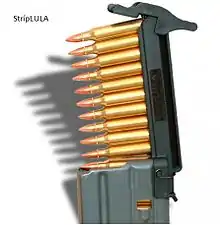A stripper clip (also known as a charger or charger clip, especially in British and in Commonwealth military vocabulary) is a speedloader that holds several cartridges (usually between 5 and 10) together in a single unit for easier and faster loading of a firearm magazine.[1]