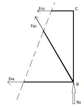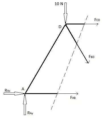 This method can be used when the truss element forces of only a few members are to be found. This method is used by introducing a single straight line cutting through the member whose force has to be calculated. However this method has a limit in that the cutting line can pass through a maximum of only 3 members of the truss structure. This restriction is because this method uses the force balances in the x and y direction and the moment balance, which gives a maximum of 3 equations to find a maximum of 3 unknown truss element forces through which this cut is made. Find the forces FAB, FBD and FCD in the above example