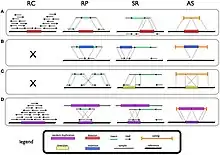 Signatures and patterns of SVs for deletion (A), novel sequence insertion (B), inversion (C), and tandem duplication (D) in read count (RC), read-pair (RP), split-read (SR), and de novo assembly (AS) methods.[29]