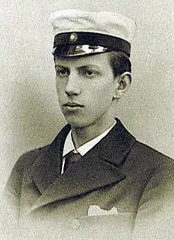 The Swedish student cap (studentmössa), used since the mid-19th century by high school (Gymnasium) graduates, normally has a white crown, a black (or dark blue) band, and a black peak. At the front of the band is a cockade of blue and yellow, the colours of the Swedish flag.