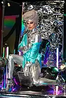 British Vogue thought Gaga looked like a "Y2K-inspired desert warrior" in the music video and called the singer's aesthetics a return to her "meat-dress-era form".[71] Dave Holmes for Esquire described Gaga's dancing in the video as "back to a kind of movement that is less 'dance' and more a series of gestures. The classics are back: 'wrists on forehead' makes a triumphant return, as do 'hand covering eye' and 'forearms in x formation'."[70] Craig Jenkins for Vulture described the video as a "purposeful visual overkill" with tight choreography and compared the video to the music video for "Genesis" by Grimes, the video game Bayonetta, and 1960s-era Star Trek.[72] Brandon Wetmore for Paper magazine called the video as a Mad Max-evoking "pride parade",[73] pairing "Bad Romance"-era choreography with Artpop-era camp and contrasted the vibrancy and color of the video with the muted and somber tones of the visuals from the previous A Star Is Born era.[73] Sabrina Barr of The Independent highlighted the "outlandish" costumes of the video, saying that "the fashion in the video is as idiosyncratic and fabulous as Gaga herself", and pointed out inspirations from Power Rangers and the Alien films.[67] Alexa Camp for Slant Magazine was critical of the video, calling it corny and lacking "the (comparatively) sophisticated mythology or narrative of videos like 2011's 'Born This Way'."[39]