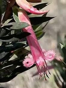 Styphelia triflora, commonly known as pink five-corners,[2] is a flowering plant in the heath family Ericaceae. It is an erect, spreading shrub with broad leaves with a spiky tip, and usually pink tubular flowers with the petals rolled back. It is found in New South Wales and Queensland growing on loam or sandy soils.