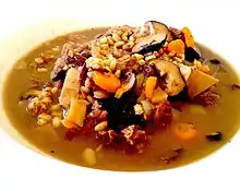 The soup often includes onions and potatoes and is simply seasoned with salt, black pepper, and bay leaves. The soup is often thickened with rice or by soaking barley in the water overnight so that the starches leach into the water.