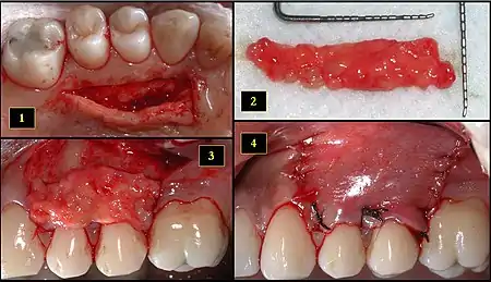 In dentistry, the subepithelial connective tissue graft (SECT graft, and sometimes referred to simply as a connective tissue (CT) graft) is an oral and maxillofacial surgical procedure first described by Alan Edel in 1974.[1] Currently, it is generally used to obtain root coverage following gingival recession, which was a later development by Burt Langer in the early 1980s.[2]