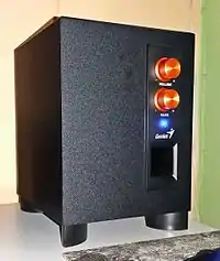 During the 1940s swing era, to get deeper bass, "pipelike opening[s]" were cut into speaker enclosures, creating bass reflex enclosures, as it was found that even a fairly inexpensive speaker enclosure, once modified in this way, could "transmit the driving power of a heavy...drumbeat—and sometimes not much else—to a crowded dancefloor."[6] Prior to the development of the first subwoofers, woofers were used to reproduce bass frequencies, usually with a crossover point set at 500 Hz and a 4-inch (10 cm) loudspeaker in an infinite baffle or in professional sound applications, a "hybrid horn-loaded" bass reflex enclosure (such as the 15-inch Altec Lansing A-7 enclosure nicknamed the "Voice of the Theater", which was introduced in 1946).[8] In the mid-1950s, the Academy of Motion Picture Arts and Sciences selected the "big, boxy" Altec A-7 as the industry standard for movie sound reproduction in theaters.[9]