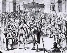 Mayenne was opposed to the idea of summoning the Estates-General to elect a king, but in 1592, he finally caved in to Spanish pressure to do so. Mayenne opened the assembly with a symbolically empty chair beside him.[14] The influence of Spain on the assembly soon proved problematic. Spain sought the election of the Infanta Isabella Clara Eugenia of Spain, the daughter of Philip II of Spain and the granddaughter of Catherine de' Medici. The Spanish urged the Estates-General to repeal the Salic Law, which prevented the rule of a queen regnant, but in so doing, they failed to grasp a fundamental principle of the French royal succession.[15]