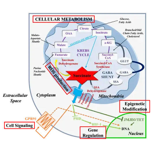 In addition to its metabolic roles, succinate serves as an intracellular and extracellular signaling molecule.[6][26] Extra-mitochondrial succinate alters the epigenetic landscape by inhibiting the family of 2-oxogluterate-dependent dioxygenases.[26] Alternative, succinate can be released into the extracellular milieu and the blood stream where it is recognized by target receptors.[30] In general, leakage from the mitochondria requires succinate overproduction or underconsumption and occurs due to reduced, reverse or completely absent activity of SDH or alternative changes in metabolic state. Mutations in SDH, hypoxia or energetic misbalance are all linked to an alteration of flux through the TCA cycle and succinate accumulation.[6][26][31] Upon exiting the mitochondria, succinate serves as a signal of metabolic state, communicating to neighboring cells how metabolically active the originating cell population is.[26] As such, succinate links TCA cycle dysfunction or metabolic changes to cell-cell communication and to oxidative stress-related responses.