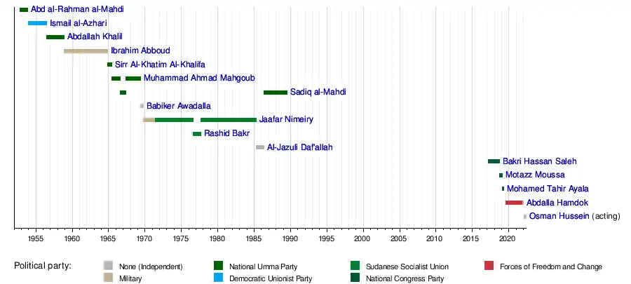 This article lists the heads of government of Sudan, from the establishment of the office of Chief Minister in 1952 until the present day. The office of Prime Minister was abolished after the 1989 coup d'état,[1] and reestablished in 2017 when Bakri Hassan Saleh was appointed Prime Minister by President Omar al-Bashir.[2]