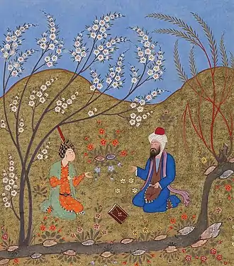 Devotion to Muhammad is the strongest practice within Sufism.[104] Sufis have historically revered Muhammad as the prime personality of spiritual greatness. The Sufi poet Saadi Shirazi stated, "He who chooses a path contrary to that of the prophet shall never reach the destination. O Saadi, do not think that one can treat that way of purity except in the wake of the chosen one."[105] Rumi attributes his self-control and abstinence from worldly desires as qualities attained by him through the guidance of Muhammad. Rumi states, "I 'sewed' my two eyes shut from [desires for] this world and the next – this I learned from Muhammad."[106] Ibn Arabi regards Muhammad as the greatest man and states, "Muhammad's wisdom is uniqueness (fardiya) because he is the most perfect existent creature of this human species. For this reason, the command began with him and was sealed with him. He was a Prophet while Adam was between water and clay, and his elemental structure is the Seal of the Prophets."[107] Attar of Nishapur claimed that he praised Muhammad in such a manner that was not done before by any poet, in his book the Ilahi-nama.[108] Fariduddin Attar stated, "Muhammad is the exemplar to both worlds, the guide of the descendants of Adam. He is the sun of creation, the moon of the celestial spheres, the all-seeing eye...The seven heavens and the eight gardens of paradise were created for him; he is both the eye and the light in the light of our eyes."[109] Sufis have historically stressed the importance of Muhammad's perfection and his ability to intercede. The persona of Muhammad has historically been and remains an integral and critical aspect of Sufi belief and practice.[104] Bayazid Bastami is recorded to have been so devoted to the sunnah of Muhammad that he refused to eat a watermelon because he could not establish that Muhammad ever ate one.[110]